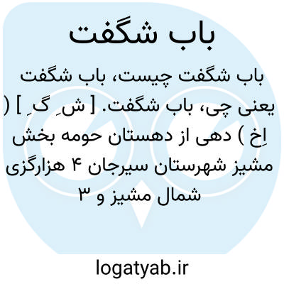 باب شگفت. [ ش ِ گ ِ ] ( اِخ ) دهی از دهستان حومه بخش مشیز شهرستان سیرجان 4 هزارگزی شمال مشیز و 3 هزارگزی خاور راه شوسه کرمان به سیرجان. جلگه، سردسیر. سکنه آن 80 تن. آب آن از قنات تأمین می شود. محصول آنجا غلات و حبوبات می باشد. شغل اهالی زراعت و مال داری است. راه مالرو دارد. ( فرهنگ جغرافیائی ایران ج 8 ).