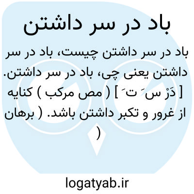 باد در سر داشتن. [ دَرْ س َ ت َ ] ( مص مرکب ) کنایه از غرور و تکبر داشتن باشد. ( برهان ) ( آنندراج ) ( انجمن آرا ). رجوع به باد در زیر دامن داشتن و باد در کلاه بودن و باد در کلاه افکندن و باد در کلاه داشتن و باد در سر بودن و باد در سر کردن و باد در سر افکندن و باد در سر شدن و باد سنجیدن و باد شود. || اندیشه های فاسد داشتن. ( از برهان ) ( آنندراج ) ( انجمن آرا ). رجوع به باد در سر کردن و باد درسر بودن و باد در کلاه افکندن و باد در کلاه بودن و باد در کلاه داشتن و باد در زیر دامن داشتن و باد در سر افکندن و باد در سر شدن و باد سنجیدن و باد شود.