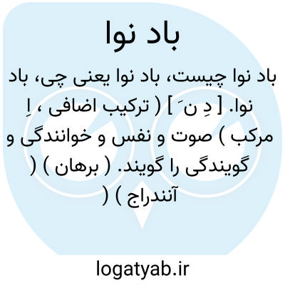 باد نوا. [ دِ ن َ ] ( ترکیب اضافی، اِ مرکب ) صوت و نفس و خوانندگی و گویندگی را گویند. ( برهان ) ( آنندراج ) ( انجمن آرا ). صوت و خوانندگی و گویندگی. ( ناظم الاطباء ) ( هفت قلزم ). ساز و نغمه و نقاره. ( فرهنگ ضیاء ). صوت و صدا.( فرهنگ دساتیر از آنندراج ). رجوع به بادآهنگ شود.