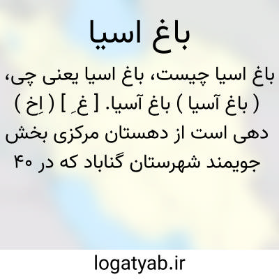 ( باغ آسیا ) باغ آسیا. [ غ ِ ] ( اِخ ) دهی است از دهستان مرکزی بخش جویمند شهرستان گناباد که در 40 هزارگزی شمال جویمند بر سر راه شوسه عمومی بجستان در جلگه واقع است. ناحیه ای است گرمسیربا 698 سکنه و آب آن از قنات تأمین میشود. محصول عمده آن غلات و زعفران و شغل مردمش زراعت و راهش اتومبیل رو است. ( از فرهنگ جغرافیایی ایران ج 9 ).