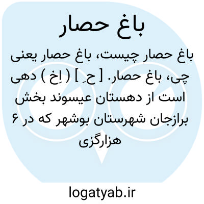 باغ حصار. [ ح ِ ] ( اِخ ) دهی است از دهستان عیسوند بخش برازجان شهرستان بوشهر که در 6 هزارگزی جنوب باختر برازجان در کنار شوسه برازجان به بوشهر در جلگه قرار دارد. ناحیه ای است گرمسیر دارای 160 تن سکنه. آب آن از چاه تأمین میشود. محصول عمده آن غلات و خرما و تنباکو و شغل مردمش زراعت است. ( از فرهنگ جغرافیایی ایران ج 7 ).