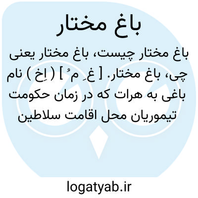 باغ مختار. [ غ ِ م ُ ] ( اِخ ) نام باغی به هرات که در زمان حکومت تیموریان محل اقامت سلاطین بوده است: آن پادشاه پاک اعتقاد [ بابر ] در 25 شعبان سنه ستین و ثمانمائه... از باغ سفید به باغ مختار تشریف برد. ( حبیب السیر ج 4 ص 56 ). و میرزا سلطان ابراهیم در باغ مختار نزول نمود. ( همان کتاب ص 66 ). [ سلطان ابراهیم ] صباح سه شنبه هفتم رجب نزدیک بباغ مختار رسید. ( روضات الجنات فی اوصاف مدینة هرات ج 2 ص 197 ).