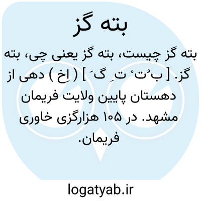 بته گز. [ ب ُت ْ ت ِ گ َ ] ( اِخ ) دهی از دهستان پایین ولایت فریمان مشهد. در 105 هزارگزی خاوری فریمان. سکنه آن 86 تن،آب از قنات. محصول آن غلات و چغندر و شغل اهالی زراعت و مالداری است. ( از فرهنگ جغرافیایی ایران ج 9 ).