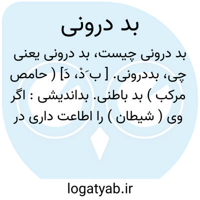 بددرونی. [ ب َدْ، دَ] ( حامص مرکب ) بد باطنی. بداندیشی: اگر وی ( شیطان ) را اطاعت داری در تو صفت گربزی و خیانت و تخلیط و بددرونی و فریفتن و تلبیس بدید آید. ( کیمیای سعادت ).