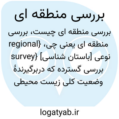 {regional survey} [باستان شناسی] نوعی بررسی گسترده که دربرگیرندۀ وضعیت کلی زیست محیطی پیرامون یک محوطۀ باستان شناختی است