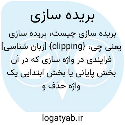 {clipping} [زبان شناسی] فرایندی در واژه سازی که در آن بخش پایانی یا بخش ابتدایی یک واژه حذف و درنتیجه صورت کوتاه تری ایجاد می شود