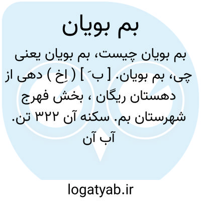 بم بویان. [ ب َ ] ( اِخ ) دهی از دهستان ریگان، بخش فهرج شهرستان بم. سکنه آن 322 تن. آب آن از قنات و محصول آن خرما و غلات و حنا است. ( از فرهنگ جغرافیایی ایران ج 8 ).