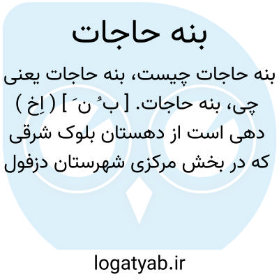بنه حاجات. [ ب ُ ن َ ] ( اِخ ) دهی است از دهستان بلوک شرقی که در بخش مرکزی شهرستان دزفول واقع شده است. و دارای 200 تن سکنه است. ( از فرهنگ جغرافیائی ایران ج 6 ).