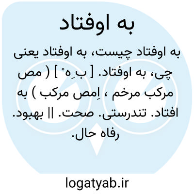 به اوفتاد. [ ب ِه ْ ] ( مص مرکب مرخم، اِمص مرکب ) به افتاد. تندرستی. صحت. || بهبود. رفاه حال. ( فرهنگ فارسی معین ):