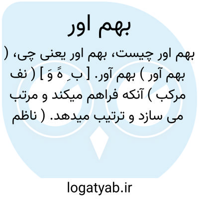 ( بهم آور ) بهم آور. [ ب ِ هََ وَ ] ( نف مرکب ) آنکه فراهم میکند و مرتب می سازد و ترتیب میدهد. ( ناظم الاطباء ). || ( ن مف مرکب ) تألیف کرده شده. ( آنندراج ). مجتمع و مرتب. ( ناظم الاطباء ).