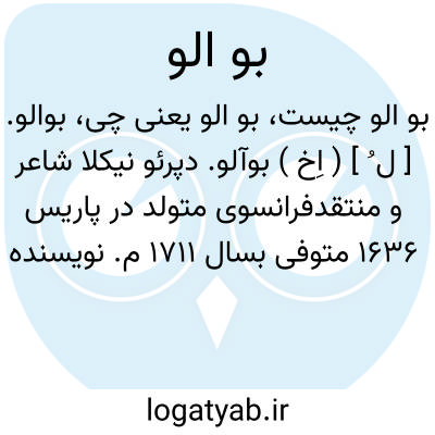 بوالو. [ ل ُ ] ( اِخ ) بوآلو. دپرئو نیکلا شاعر و منتقدفرانسوی متولد در پاریس 1636 متوفی بسال 1711 م. نویسنده هجویات، مکاتیب ( اپیر )، هنر شاعرانه و غیره. وی به تقلید هوراس لاتینی، هم خود را مصروف شعر اخلاقی و هجایی کرد و مخصوصاً در انتقاد ادبی زبردست بود. ( فرهنگ فارسی معین ).