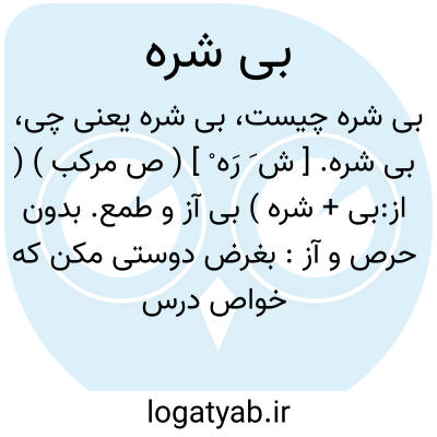 بی شره. [ ش َ رَه ْ ] ( ص مرکب ) ( از:بی + شره ) بی آز و طمع. بدون حرص و آز: