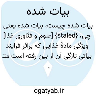 {staled} [علوم و فنّاوری غذا] ویژگی مادۀ غذایی که براثر فرایند بیاتی تازگی آن از بین رفته است متـ. بیات 2