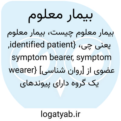 {identified patient, symptom bearer, symptom wearer} [روان شناسی] عضوی از یک گروه دارای پیوندهای قوی، مانند خانواده، که علائم اختلال روانی در او بروز می کند و درمان او نیازمند توجه و رسیدگی به وضع سایر اعضای گروه است که ظاهراً بیمار نیستند