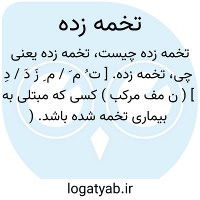 تخمه زده. [ ت ُ م َ / م ِ زَ دَ / دِ ] ( ن مف مرکب ) کسی که مبتلی به بیماری تخمه شده باشد. ( ناظم الاطباء ): مَدیقة؛ گوسپند بیمار و تخمه زده. ( منتهی الارب ). || نانی دارای تخمه. ( ناظم الاطباء ).