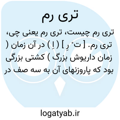 تری رم. [ ت ْ رِ ] ( اِ ) در آن زمان ( زمان داریوش بزرگ ) کشتی بزرگی بود که پاروزنهای آن به سه صف در سه طبقه جا میگرفتند( ایران باستان ج 1 ص 561 ). و رجوع به همین کتاب ج 1 ص 668، 740 و ج 2 ص 926، 1006، 1112، 1135، 1174، 1242، 1485، 1923 و ج 3 ص 1971، 1976، 1978، 2006 شود.