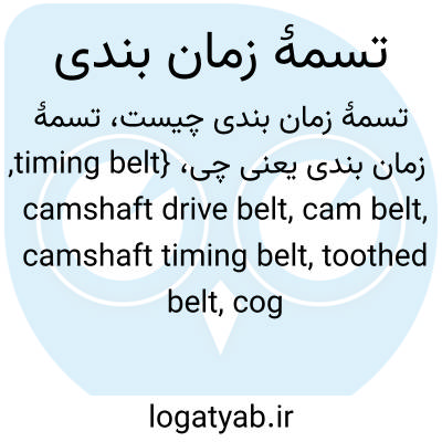 {timing belt, camshaft drive belt, cam belt, camshaft timing belt, toothed belt, cog belt, camshaft belt} [قطعات و مجموعه های خودرو] تسمه ای دندانه دار که برای هماهنگ کردن زمان باز و بسته شدن سوپاپ ها حرکت میل لنگ را به میل بادامک منتقل می کند