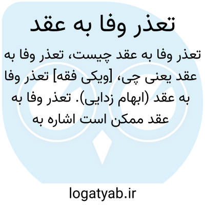 [ویکی فقه] تعذر وفا به عقد (ابهام زدایی). تعذر وفا به عقد ممکن است اشاره به معانی ذیل باشد: فقه• قاعده تعذر وفا به مدلول عقد، یکی از قواعد فقهی• مصادیق قاعده تعذر وفا به عقد، مصادیق قاعده تعذر وفا به عقد در فقه حقوق• تعذر وفا به عقد در حقوق ایران، بحث از تعذر وفا به عقد در حقوق ایران• تعذر وفا به عقد در حقوق خارجی، بحث از تعذر وفا به عقد در حقوق خارجی