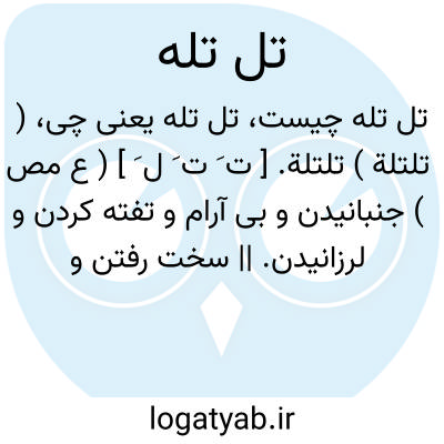 ( تلتلة ) تلتلة. [ ت َ ت َ ل َ ] ( ع مص ) جنبانیدن و بی آرام و تفته کردن و لرزانیدن. || سخت رفتن و سخت راندن. ( منتهی الارب ) ( آنندراج ) ( ناظم الاطباء ) ( از اقرب الموارد ). || کسره خواندن تای تفعلون را. ومنه ُ تلتلة بهراء لأَ نهم یکسرونها، زیرا قبیله بهراء این تا را مکسور میخوانند. ( از منتهی الارب ) ( از آنندراج ) ( ناظم الاطباء ). || ( اِ ) سختی. ( منتهی الارب ) ( آنندراج ) ( ناظم الاطباء ) ( از اقرب الموارد ): لقی منه تلتلة؛ ای شدة. ( اقرب الموارد ). || زلزله. ( منتهی الارب ) ( آنندراج ) ( ناظم الاطباء ). || کوزه از پوست طلع. ج، تلاتل. ( منتهی الارب ) ( آنندراج ) ( ناظم الاطباء ) ( از اقرب الموارد ). || یاوه. پرحرفی. ج، تلاتل. ( دزی ج 1 ص 150 ).