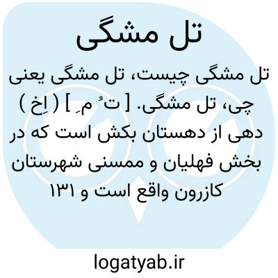 تل مشگی. [ ت ُ م ِ ] ( اِخ ) دهی از دهستان بکش است که در بخش فهلیان و ممسنی شهرستان کازرون واقع است و 131 تن سکنه دارد. ( از فرهنگ جغرافیایی ایران ج 7 ).