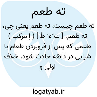 ته طعم. [ ت َه ْ طَ ] ( اِ مرکب ) طعمی که پس از فروبردن طعام یا شرابی در ذائقه حادث شود. خلاف اولی و غالباً نامطبوع: ته طعم این شراب خوب نیست. ( یادداشت بخط مرحوم دهخدا ).