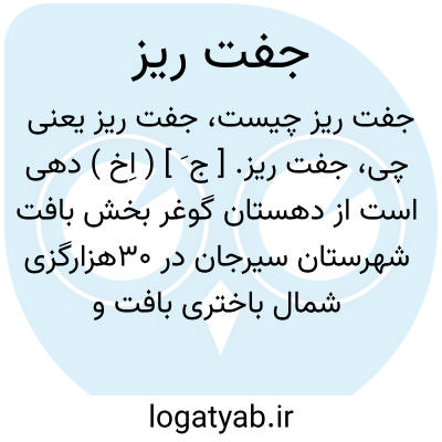 جفت ریز. [ ج َ ] ( اِخ ) دهی است از دهستان گوغر بخش بافت شهرستان سیرجان در 30هزارگزی شمال باختری بافت و 2هزارگزی خاور گوغر. کوهستانی و سردسیر است و سکنه آن 747 تن اند. آب آن از چشمه و محصول آن غلات و حبوبات و شغل اهالی زراعت و صنایع دستی آنان قالی بافی بدون نقشه است. راه مالرو دارد و ساکنین آن از طایفه افشار هستند. ( از فرهنگ جغرافیایی ایران ج 8 ).
