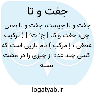 جفت و تا. [ ج ُ ت ُ ] ( ترکیب عطفی، اِ مرکب ) نام بازیی است که کسی چند عدد از چیزی را در مشت بسته میگیرد و از حریف می پرسد جفت یا تا؟ اگر حریف درست بگوید آن چیز مال او میشود و الا معادل آن باید به آن کس بدهد و اکنون در ایران این بازی را طاق و جفت و جفت و طاق میگویند. ( فرهنگ نظام ).