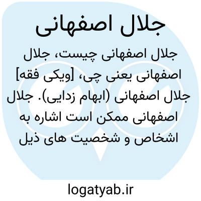 [ویکی فقه] جلال اصفهانی (ابهام زدایی). جلال اصفهانی ممکن است اشاره به اشخاص و شخصیت های ذیل باشد: • جلال برجیس بن ابوطالب بروجنی اصفهانی، شاعر ادب معاصر در اصفهان• جلال بن اسماعیل تاج اصفهانی، استاد بلند آوازه آواز ایران در اصفهان• جلال بن مؤمن اسیر شهرستانی اصفهانی، شاعر ادیب، از مشاهیر سخن وران عصر صفویه در اصفهان• جلال یقین کاشانی اصفهانی، شاعر ادیب عصر صفویه در اصفهان• سیدجلال بن سیدمرتضی مجتهد حسینی هومانی، عالم فاضل قرن سیزده و چهارده هجری در اصفهان• شاطر جلال اصفهانی، از شعراء و از طبقه رامشگر و مطربان در اصفهان