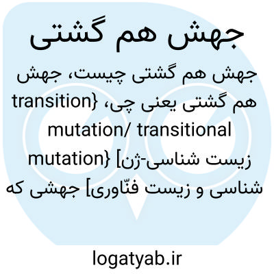 {transition mutation/ transitional mutation} [زیست شناسی-ژن شناسی و زیست فنّاوری] جهشی که در آن یک باز پیریمیدین جانشین پیریمیدینی دیگر یا یک باز پورین جانشین پورینی دیگر میشود متـ. هم گشت transition 2
