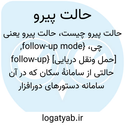 {follow-up mode, follow-up} [حمل ونقل دریایی] حالتی از سامانۀ سکان که در آن سامانه دستورهای دورافزار سکان را اجرا می کند و اگر سکان به وسط یا هر وضعیت دیگری برگردد، تیغۀ سکان فوراً از فرمان داده شده پیروی می کند و به وضعیت جدید می رسد اختـ. پیرو FU