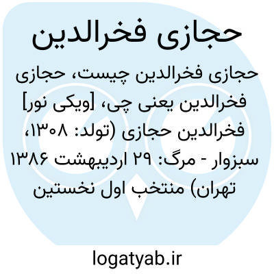 [ویکی نور] فخرالدین حجازی (تولد: ۱۳۰۸، سبزوار - مرگ: ۲۹ اردیبهشت ۱۳۸۶ تهران) منتخب اول نخستین مجلس شورای ملی ایران از حوزه تهران و نیز نماینده دوره های دوم و سوم مجلس تهران، از سخنرانان مذهبی فعال قبل از انقلاب ایران، از جمله از سخنرانان پر اقبال حسینیه ارشاد بود.