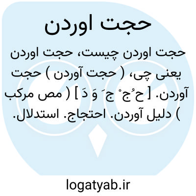 ( حجت آوردن ) حجت آوردن. [ ح ُج ْ ج َ وَ دَ ] ( مص مرکب ) دلیل آوردن. احتجاج. استدلال. ادلاء. ( تاج المصادر بیهقی ) ( مهذب الاسماء ) ( ترجمان القرآن عادل بن علی ) تعاکظ. ( منتهی الارب ). تعذر؛ عذر و حجت آوردن. ( منتهی الارب ):