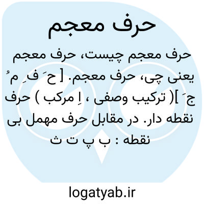 حرف معجم. [ ح َ ف ِ م ُ ج َ ]( ترکیب وصفی، اِ مرکب ) حرف نقطه دار. در مقابل حرف مهمل بی نقطه: ب پ ت ث ج چ خ ذ ز ژ ش ض ظ غ ف ق ن ی.