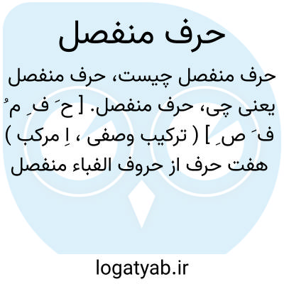 حرف منفصل. [ ح َ ف ِ م ُ ف َ ص ِ ] ( ترکیب وصفی، اِ مرکب ) هفت حرف از حروف الفباء منفصل است و آنها را حروف سبعه منفصله و خواتیم نیز نامند، که در نوشتن به حرفی دیگر منضم نگردد: ا، د، ذ، ر، ز، ژ، و. و باقی حروف را غیرمنفصله یا متصله گویند. ( کشاف اصطلاحات الفنون ).