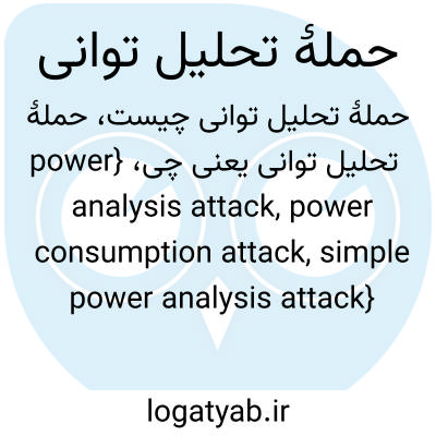 {power analysis attack, power consumption attack, simple power analysis attack} [رمزشناسی] حمله ای که در آن مهاجم با اندازه گیری توان مصرفی یک ابزار رمزنگاشتی در خلال عملیات رمزنگاشتی، می تواند به جزئیات مشخصه های اصلی آن و پیاده سازی خوارزمی/ الگوریتم رمز دست یابد