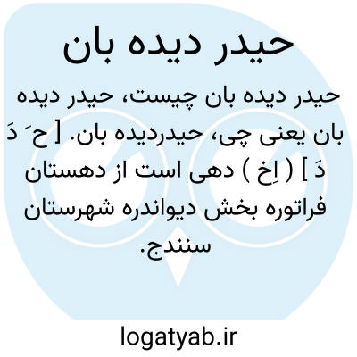 حیدردیده بان. [ ح َ دَ دَ ] ( اِخ ) دهی است از دهستان فراتوره بخش دیواندره شهرستان سنندج. ناحیه ای است کوهستانی سردسیری. دارای 120 تن سکنه.محصولاتش غلات و لبنیات است. اهالی به کشاورزی و گله داری گذران میکنند. ( از فرهنگ جغرافیایی ایران ج 5 ).