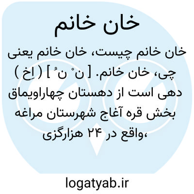 خان خانم. [ ن ْ ن ُ ] ( اِخ ) دهی است از دهستان چهاراویماق بخش قره آغاج شهرستان مراغه،واقع در 24 هزارگزی خاوری قره آغاج و 26 هزارگزی جنوب شوسه مراغه به میانه. ناحیه ای است کوهستانی با آب و هوای معتدل دارای 163 تن سکنه که شیعی مذهب و ترک زبانند. آب آنجا از چشمه و محصول آن غلات و بزرک و شغل اهالی زراعت و صنایع دستی و جاجیم بافی است. راه این ده مالرو میباشد. ( از فرهنگ جغرافیایی ایران ج 4 ).