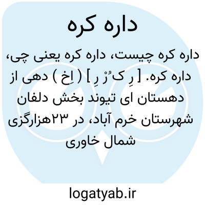 داره کره. [ رِ ک ُرْ رِ ] ( اِخ ) دهی از دهستان ای تیوند بخش دلفان شهرستان خرم آباد، در 23هزارگزی شمال خاوری نورآباد و 15هزارگزی خاور راه شوسه خرم آباد به کرمانشاه، کوهستانی، سردسیر و مالاریائی، دارای 120 تن سکنه است. آب آن از چشمه ها، محصول آنجا غلات و لبنیات، شغل اهالی زراعت و گله داری و صنایع دستی زنان سیاه چادر بافی است. راه آن مالرو و ساکنین از طایفه تیوند هستند و درزمستان قشلاق میروند. ( فرهنگ جغرافیایی ایران ج 6 ).