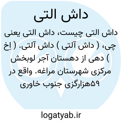( داش آلتی ) داش آلتی. ( اِخ ) دهی از دهستان آجر لوبخش مرکزی شهرستان مراغه. واقع در 59هزارگزی جنوب خاوری مراغه و 12 هزارگزی شمال خاوری شوسه شاهین دژ به میاندوآب. دره معتدل دارای 17 تن سکنه است. آب آنجا از چشمه سار، محصول آن غلات و بادام و نخودو بزرک، شغل اهالی زراعت و صنایع دستی جاجیم بافی و راه آن مالرو است. ( از فرهنگ جغرافیایی ایران ج 4 ).