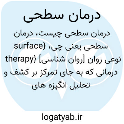 {surface therapy} [روان شناسی] نوعی روان درمانی که به جای تمرکز بر کشف و تحلیل انگیزه های ناخودآگاه و زیربنایی، به کاهش فشارهای روانی مُراجع و تعدیل نگرش ها و الگوهای رفتاری او می پردازد