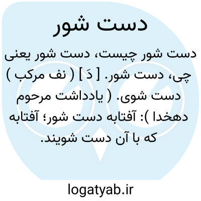 دست شور. [ دَ ] ( نف مرکب ) دست شوی. ( یادداشت مرحوم دهخدا ): آفتابه دست شور؛ آفتابه که با آن دست شویند.