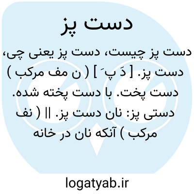 دست پز. [ دَ پ َ ] ( ن مف مرکب ) دست پخت. با دست پخته شده. دستی پز: نان دست پز. || ( نف مرکب ) آنکه نان در خانه پزد فروختن را نه در خبازی. ( یادداشت مرحوم دهخدا ). || ( اِمص مرکب ) دست پخت. پختن به دست.