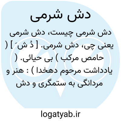 دش شرمی. [ دُ ش َ ] ( حامص مرکب ) بی حیائی. ( یادداشت مرحوم دهخدا ): هنر و مردانگی به ستمگری و دش شرمی و دروغ و بیدادی به خویش بستن نتوان. ( کارنامه اردشیر ترجمه صادق هدایت ص 9 ).