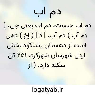 دم آب. [ دُ ] ( اِخ ) دهی است از دهستان سوسن بخش ایزه شهرستان اهواز.جمعیت آن 165 تن. ( از فرهنگ جغرافیایی ایران ج 6 ).، دماب. [دَ ] ( اِخ ) دهی است از دهستان دهق بخش نجف آباد شهرستان اصفهان. سکنه آن 855 تن. آب آن از قنات و راه آن اتومبیل رو است. ( از فرهنگ جغرافیایی ایران ج 10 ).