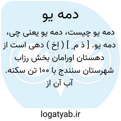 دمه یو. [ دَ م ِ ] ( اِخ ) دهی است از دهستان اورامان بخش رزاب شهرستان سنندج با 100 تن سکنه. آب آن از چشمه و راه آن اتومبیلرو است. ( از فرهنگ جغرافیایی ایران ج 5 ).