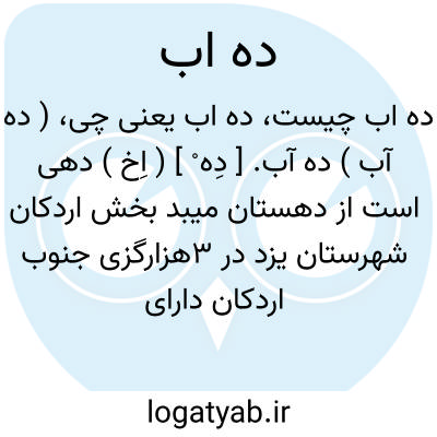 ( ده آب ) ده آب. [ دِه ْ ] ( اِخ ) دهی است از دهستان میبد بخش اردکان شهرستان یزد در 3هزارگزی جنوب اردکان دارای 1722 تن سکنه است. آب آن از قنات است و راه ماشین رو دارد. ( از فرهنگ جغرافیایی ایران ج 10 ).