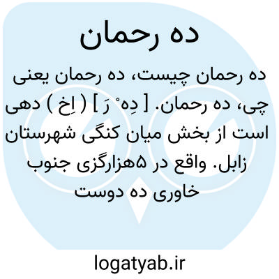 ده رحمان. [ دِه ْ رَ ] ( اِخ ) دهی است از بخش میان کنگی شهرستان زابل. واقع در 5هزارگزی جنوب خاوری ده دوست محمد. سکنه آن 144 تن. آب آن از رودخانه هیرمند تأمین می شود. ( از فرهنگ جغرافیایی ایران ج 8 ).