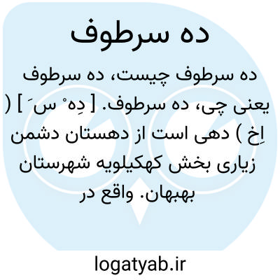 ده سرطوف. [ دِه ْ س َ ] ( اِخ ) دهی است از دهستان دشمن زیاری بخش کهکیلویه شهرستان بهبهان. واقع در 7هزارگزی شمال خاوری قلعه کلات مرکز دهستان. دارای 100 تن سکنه است. آب آن از چشمه تأمین می شود. ساکنین از طایفه ٔدشمن زیاری هستند. ( از فرهنگ جغرافیایی ایران ج 1 ).