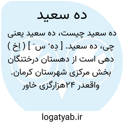 ده سعید. [ دِه ْ س َ ] ( اِخ ) دهی است از دهستان درختنگان بخش مرکزی شهرستان کرمان. واقعدر 24هزارگزی خاور کرمان. سکنه آن 120 تن. آب آن از قنات تأمین می شود. ( فرهنگ جغرافیایی ایران ج 8 ).