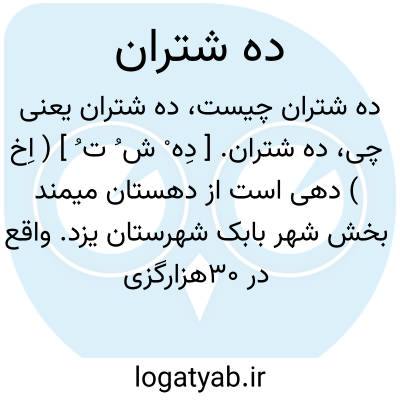 ده شتران. [ دِه ْ ش ُ ت ُ ] ( اِخ ) دهی است از دهستان میمند بخش شهر بابک شهرستان یزد. واقع در 30هزارگزی خاور شهر بابک. دارای 1104 سکنه می باشد. آب آن از قنات تأمین می شود. شغل زنان کرباس بافی. راه آن فرعی. ( از فرهنگ جغرافیایی ایران ج 10 ).